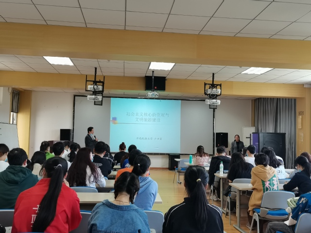 围绕讲座的主题,卢教授一开始先与同学们互动,询问大家社会主义核心价值观24字是什么,同学们异口同声答道“富强、民主、文明、和谐、自由、平等、公正、法治,爱国、敬业、诚信、友善”,声音整齐有力。然后卢教授从不同的方面展开本次讲座。由文明旅游的内涵到文明旅游建设的迫切性,从个人、政府、旅游企业、旅游从业者、媒体等各个层面展开。首先从行为视角、现象视角、发展视角等三个角度阐释了文明旅游的内涵,并讲解了三者之间的关系。又通过列举各种不文明的旅游行为阐述了文明旅游建设的迫切性。最后从多个主体出发讲述了怎样去引领文明旅游健康发展的措施。讲座内容循序渐进,条理清晰,同学们在卢教授的讲解下理解了本次讲座的主题。