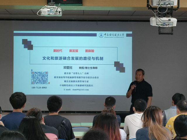 2021年5月13日下午13时30分,教育部“双带头人”名师、教育部高等学校旅游管理教学指导委员会委员、教育部和文旅部智库专家,中南财经政法大学邓爱民教授,做客江汉大讲坛,在J01A501与旅游系全体师生举行了“文化和旅游融合发展的路径与机制”的讲座和交流活动。