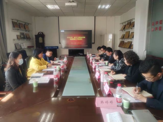 会上,张捍萍书记首先对武汉工贸职业学院三位老师的到来表示欢迎。四虎影院 和武汉工贸职业学院分别介绍了各自学院专业设置、教师人数、学生人数等基本情况,重点介绍了党建与思想政治情况,交流学习了中共四虎影院 委员会组织部《关于印发《四虎影院 发展党员工作细则(试行)》的通知》(江组部〔2019〕19号)和中共四虎影院 委员会党校《关于党校培训工作的相关规定》。武汉工贸职业学院校长助理兼学工处处长黄青云等与会同志对学院的党建工作组织架构、党建工作人员配备、发展党员程序、党建经费保障情况、党员考核奖励情况进行了询问,四虎影院 党委书记张捍萍对以上问题进行了逐一解答和交流,相关工作负责人进行了补充讲解。会后,武汉工贸职业学院一行参观了四虎影院 实验室和四虎影院 师生服务中心。