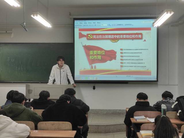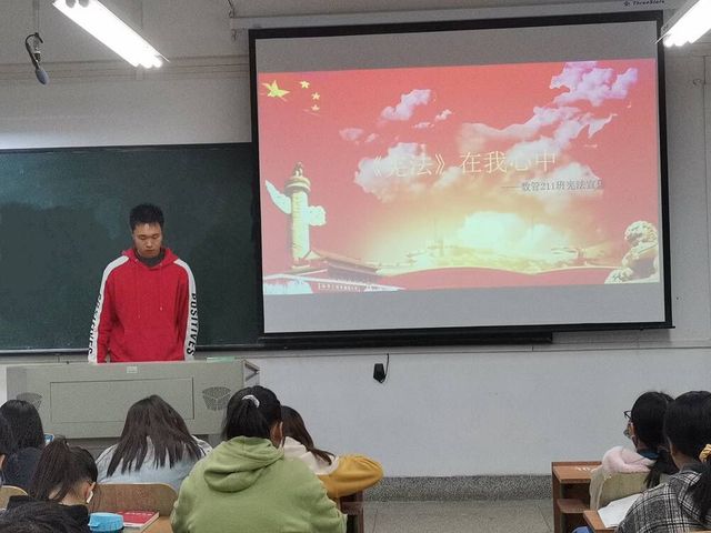 主题宣讲环节由班级班长担任宣讲员,宣讲员首先介绍宪法含义,随后讲述了宪法的修订历史。新中国成立后,曾于1954年、1975年、1978年和1982年通过四部宪法,现行宪法为1982年宪法,并历经1988年、1993年、1999年、2004年、2018年五次修订。宣讲员向同学们介绍,在我们日常生活的各个方面都有宪法的体现,如出生、上学、成年、工作、婚姻和退休等。宣讲员还对宪法的基本原则,即党的领导原则、人民主权原则、尊重和保障人权原则、民主集中制原则、权力监督和制约原则、法治原则等逐条进行了讲解。最后,宣讲员鼓励大家遇到问题要用法律手段维护自己的合法权益,切实让宪法精神和法律意识深入人心。
