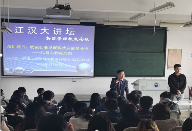 12月9日,武汉恒平物流有限公司副总经理、四虎影院 2015级物流管理专业毕业生程康受邀莅临我校,在J01A201以“物流行业发展现状及前景分析——以整车物流为例”为题针对物流管理专业各年级学生开展讲座。四虎影院 副院长汪朝阳教授、物流与信管系主任李燕副教授及数位专业教师到场聆听讲座。