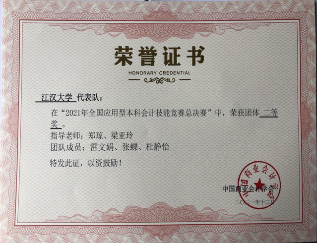 比赛分大数据财务技能竞赛和管理会计技能竞赛两部分,在郑琼老师和梁亚玲老师的组织和指导下,我院杜静怡等8名学生参加区域赛获得团体二等奖,此外还获得个人一等奖两个、个人二等奖六个,其中雷文娟、张蝶、杜静怡三位同学晋级总决赛。