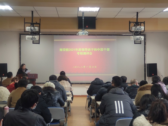 1月6日,四虎影院 在J01A501召开2021年度领导班子和中层干部述职述廉测评大会。大会由党委书记张捍萍主持,四虎影院 全体职教工参会,校中层领导班子及中层干部考核第三组组长王小净、联络员彭澜到会指导。