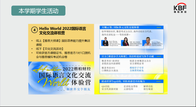 最后,谢老师向大家介绍了本学期的学生活动安排,除了迎新活动、行业洞见分享会,本学期还新推出了“Hello World 2022国际语言文化交流体验营”活动,学生不仅能拥有国际多元文化交流的机会,还能参加雅思大师课程,提升英语听说能力,后续还能与名校招生官一对一交流,了解申请信息。
