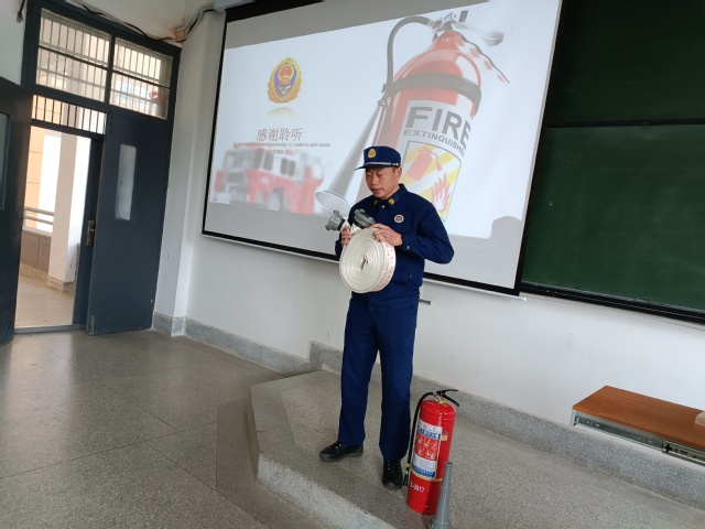 陈队长还通过讲解火灾发生的原因,基本的消防知识及消防设施器材的使用,向同学们详细讲述了如何高效报火警,如何扑救初期火灾,遭遇火灾时如何逃生与自救等知识。陈队长不仅从理论层面为大家讲授,还现场向同学们示范正确使用灭火器、水带等消防和逃生工具方法。