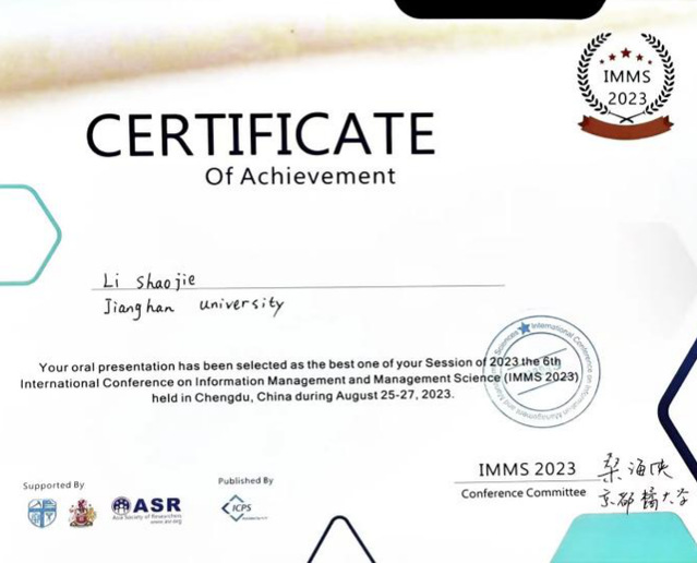 2023年8月25-27日,2023年第六届信息管理与管理科学国际会议(IMMS 2023)在成都成功举行。IMMS会议旨在为信息管理与管理科学领域的专家、学者、企业家等,提供一个交流最新研究成果的学术平台。四虎影院 2022级会计专业硕士研究生李少杰的论文《Research on the Evaluation of Financial Performance of Listed Companies in China's Automotive Manufacturing Industry——Based on PCA-DEA Model》被会议收录并受邀报告交流。
