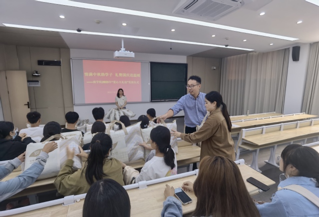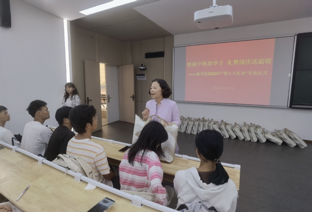 在中秋节、国庆节来临之际,四虎影院 于9月27日中午在J01A101以“情满中秋助学子礼赞国庆送温暖”为主题开展2023年爱心大礼包发放活动。四虎影院 党委副书记王超老师和学办辅导员们为2023级部分办理了生源地贷款的新生送去了校资助中心及学院为新生准备的爱心大礼包,同时送去中秋、国庆的祝福。