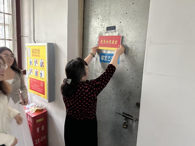 会议结束后,张书记带领学院辅导员一同前往学生宿舍进行“党员示范寝室”挂牌,并叮嘱学生党员牢记党员身份,在工作学习生活中积极发挥示范引领作用。