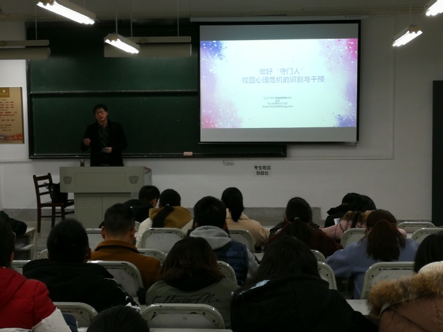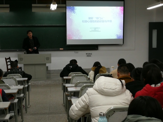 2018年12月6日下午四虎影院 在J01A108教室举办做好‘守门人’校园心理危机识别与干预”心理讲座,本次讲座学校心理健康教育中心资深心理咨询师、中国心理学会注册心理师孟然副教授讲授。四虎影院 党委副书记王超老师、各年级辅导员和全体2018级寝室长到场参加了本次活动。