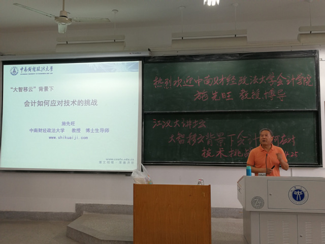 425日下午1点半,在J01A201阶梯教室,来自中南财经政法大学的施先旺教授带来了主题为 大智移云背景下会计如何应对信息技术的挑战的精彩讲座。我院会计系老师和全同学共180多人聆听了讲座。讲座伊始,由我院会计系主任何静老师介绍讲座专家施先旺教授,并代表会计系对施教授的到来表达了热烈的欢迎。在讲座中,施教授给到场的师生精彩讲述了大智移云背景下会计如何应对信息技术的挑战。施教授首先分析了 “大(数据)智(人工智能)移(动互联网)云(云计算)、物(物联网)、区(区块链)等新技术对会计的冲击:传统会计的将不复存在;计算机解决传统的手工账簿工作;数据库解决传统的纸质会计数据;共享型业务取代传统的财务部门;区块链技术简化会计中间流程。紧接着,施教授提出了京东三问:你的账有京东做得好吗?;你的账做得有意义吗?;你在京东买东西能用支付宝支付吗?,从而引出了本次讲座的主题——时代快速变革和数据竞争环境下会计应如何转变才能存活下来的问题。最后,施先旺教授总结出业财合一,流程管控的会计思想和借助小孩之手提出会计沙盘模型提出会计融入业务,全局反映资金运动,主动和信息系统融合。同时会计工作要由分离到融合,由后台到前台,由被动到主动。会计人员应在大数据浪潮下迎难而上,主动引领,实现自身价值。