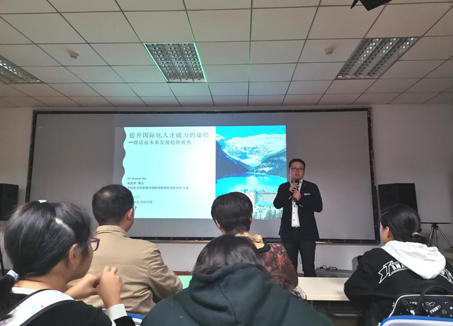 11月7日下午18:00,现任加拿大多伦多大学国际部主任,四虎影院 旅游与酒店管理系95级优秀毕业生谢爱军博士应邀做客江汉大讲坛,在J01A501导游实训室举行了题为“提升国际化人才能力的途径--酒店业未来发展趋势视角”的讲座。本次讲座由旅游与酒店管理系张金霞教授主持,四虎影院 副院长黄其新教授及全院师生二百余人参加了讲座。