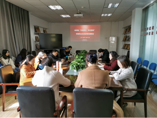 12月12日上午,四虎影院 在J01A503会议室召开“不忘初心、牢记使命”专题民主生活会情况通报会及主题教育回头看座谈会。会议由学院党委书记张捍萍同志主持,院党委成员、院长陈磊、三办主任、党支部书记、系主任代表及院两代会代表、学生代表等参加会议。