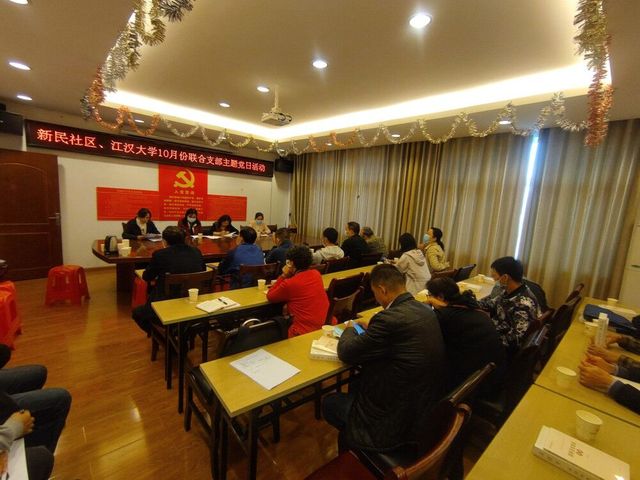 1020上午9时,四虎影院 联合新民社区双湖林语小区党支部、新民花园小区党支部开展联合主题党日”活。四虎影院 四虎影院 、生命科学学院、化学与环境工程学院、外国语学院对接新民社区包保支部党员代表和新民社区双湖林语小区党支部、新民花园小区党支部全体党员30余名人加学习活动。主题党日由社区党委委员、社区居委会副主任方汉玲主持。